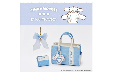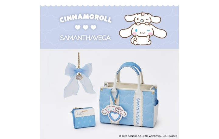 サマンサベガからサンリオキャラクター「シナモロール」との コラボコレクションが登場♡ 「シナモロール」をイメージしたバッグ、折財布、バッグチャームの全3アイテムがラインナップ。