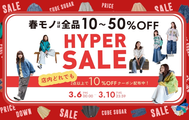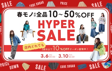 5日間限定!春モノまとめ買いが断然おトクなHYPER SALE♪ 春物アイテムが、なんとほぼ全品10%〜50%OFFと大変お買い得です。 さらに新作も対象の500円オフクーポンも配布中! 数に限りがあるアイテムもございますので、 ぜひお早めにチェックしてくださいね!