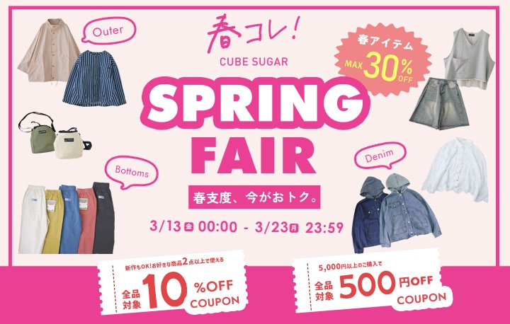 春コレ!SPRING FAIR CUBE SUGARの春これ欲しい!おすすめアイテムを集めました。 軽やかなアウターや、春コーデに欠かせないデニム・ボトムス、バッグなど 春の必需品が今だけおトクに! 今すぐ使えるアイテムから、これから活躍する春服まで 最大30%OFF! 「春これ欲しい!」がきっと見つかります◎ クーポン配信中! ・全品対象2点以上で 10%OFF ・5,000円以上で 500円OFF 春支度は今がチャンス! CUBE SUGARの春コレをぜひチェックしてください✨