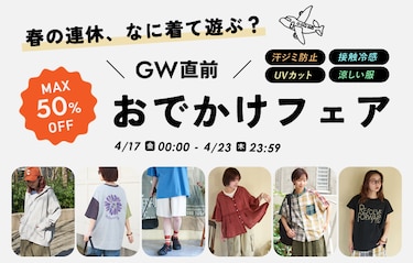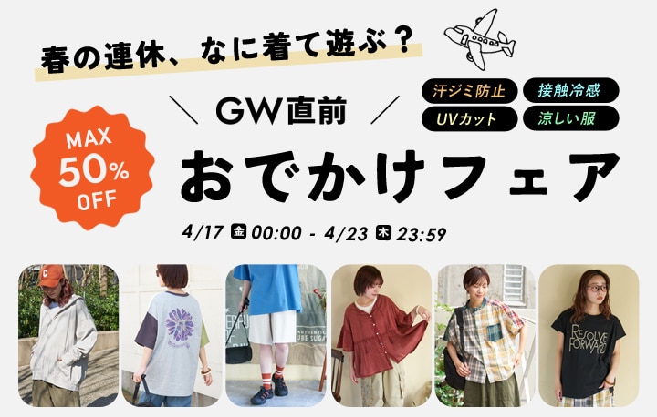 いよいよ待ちに待ったゴールデンウィーク! お出かけがもっと楽しくなる「GW直前SALE」を開催! 今すぐ使える春物から、夏まで活躍する新作アイテムまで、 全品10%〜50%OFFと大変お買い得! さらに2点で10%OFFや3点で20%OFFとおまとめ買いもオトクに♪ 新作アイテム対象の300円オフクーポンも配布中! 「何を着ていこう?」と迷っているなら、今がチャンス。 ぜひご覧くださいませ。
