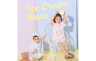 とろけるアイスクリームの世界から飛び出してきたような、KIDS & BABYの夏の新作コレクション。 グラデーションボーダーのニットは、軽やかな'スムーズィーライト'素材でやさしく包み込みます。 カットソーには、アイスとたわむれるベアたちを描いた遊び心のあるデザインを、 涼やかな冷感素材で仕上げました。ボトルホルダーやプールバッグなど夏ならではのグッズも揃い、 親子で楽しめる夢いっぱいのラインアップ。カラフルなアイスクリームやベアたちと一緒に、ひと夏の物語を。