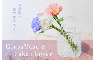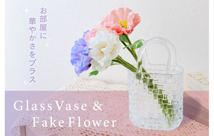 ふんわりとしたフリルフラワーを、バッグ型のガラスベースに添えて。 花のやわらかさとガラスのきらめきが調和し、空間に上品な華やかさをプラスします。 是非ご覧ください!