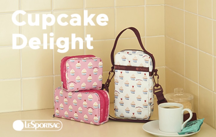 ふんわりクリームをのせたカップケーキが並ぶ、見ているだけで心ときめくスイーツ柄。
