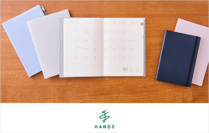 毎年ご好評いただいているハンズオリジナルの「hands+(ハンズプラス) ダイアリー」。 おすすめのポイントは白色のトーンを落とし、少し黄色味を加えた「ハンズオリジナルペーパー」。やさしい色味のにすることで、目がチカチカしにくく文字が読みやすい紙になっています。裏抜けしにくい適度なラフ感のあるザラザラした質感もこだわりです。 レイアウトは全5種類!お好みや目的に合わせてお選びいただけます。今年は追加できるログノートも仲間入りました! ①マンスリープロックタイプ ②ウィークリーレフト ③ウィークリーバーチカル ④マンスリーガントチャート ⑤ウィークリーブロック +新登場!3種類のログノート!