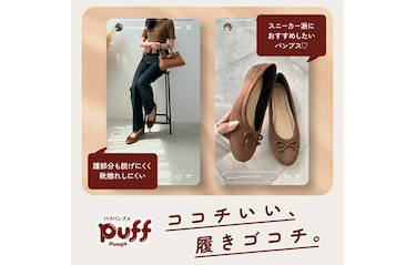 ココチいい、履きゴコチ。 はきゴコチ、極上。 モチっ。ふわっ。新感覚のパンプス“PUFF PUMPS” (パフパンプス) 包み込まれるようにフィットするパンプスから秋冬の新素材・カラーが登場。