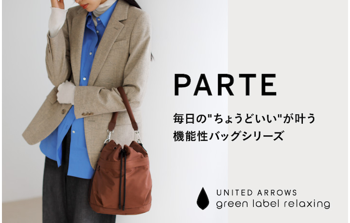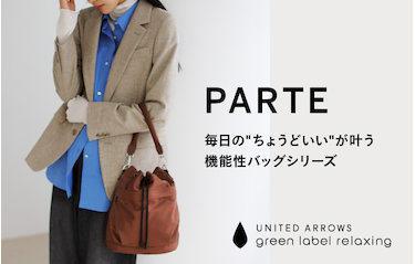 気軽に使えて機能的。毎日の“ちょうどいい”がかなう。 green label relaxing の新しいバッグシリーズ<PARTE(パルト)>。 どんなシーンにもフィットする。 パートナーのように頼れるアイテムです。