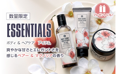 エッセンシャルズシリーズから、爽やかな甘さとエレガントさを感じるぺアー&マグノリアの香りが数量限定で登場! しっとりとした肌に仕上げるボディウォッシュ、温感効果のあるボディクリーム、美髪に整える洗い流さないヘアミルクで、贅沢なケアタイムを。