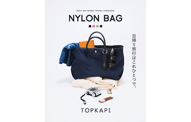 セミマットな光沢をまとったナイロンのボディに 同色のレザーハンドルをコンビネーション。 メタルのホックをポイントに効かせたミニマルなトートバッグがお目見えです。