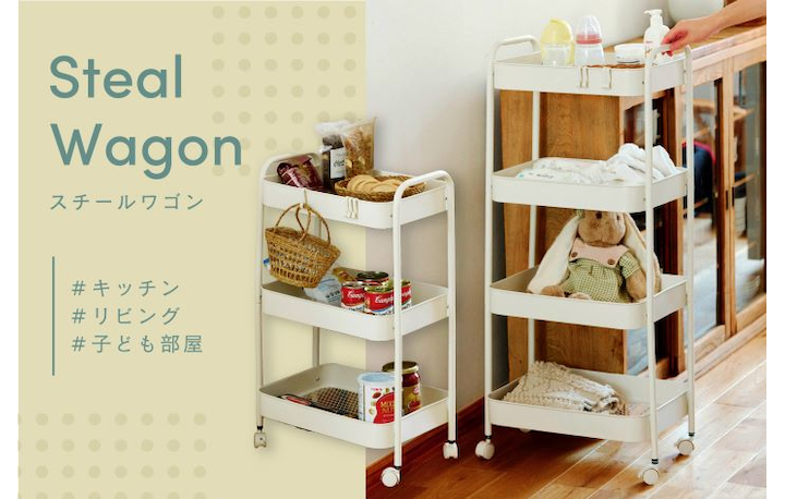 すっきりとしたデザインのスチールワゴンは、リビングやキッチン、お部屋など様々なシーンで活躍。 シンプルながらも収納力があり、日常をすっきりと整えてくれるアイテムです。