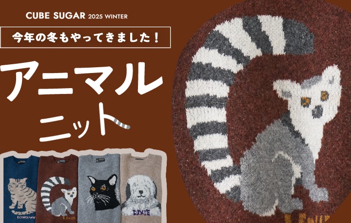 どれが好き?着るだけでほっこりする癒し系ニット。 毎年人気の「アニマルニットシリーズ」今年はキツネザルが新しく仲間入り。 くるりとしたシッポが印象的な「LEMUR(キツネザル)」に加え、ネコは2タイプ。 大人っぽく凛とした表情の「黒猫(名前はLUCY)」と、どこか気ままな雰囲気が可愛い「LOOK AWAY(あっちを向く猫)」が揃いました。 さらに、ふわふわの毛並みに包まれた「オールド・イングリッシュ・シープドッグ、DIXIE」も登場。 目が毛で隠れた姿がなんとも愛らしく、見ているだけで癒されます。