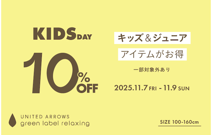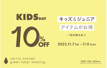 日頃のご愛顧に感謝の気持ちを込めまして、11月7日(金)より、「KIDS DAY 10%OFFキャンペーン」を開催いたします。 キッズ・ジュニアアイテムを、特別価格でお買い求めいただけます。 ぜひこの機会にお買い物をお楽しみください。