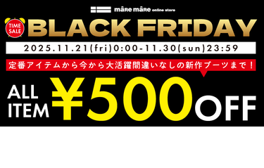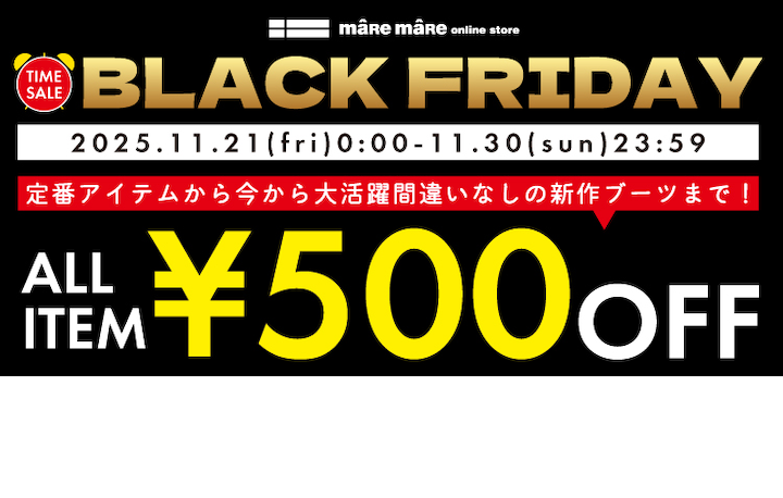 マーレマーレデイリーマーケットのBLACK FRYDAY開催中!! 店内のシューズが今だけ全品500円オフで買えちゃいます♪ 今から活躍の高機能ブーツも人気定番商品の対象となってますので今がチャンス。 おすすめ商品はこのページからご覧いただけます。 ぜひこの機会をお見逃しなく!!! ※商品代金より500円オフ後のオフ率が表示されてます※