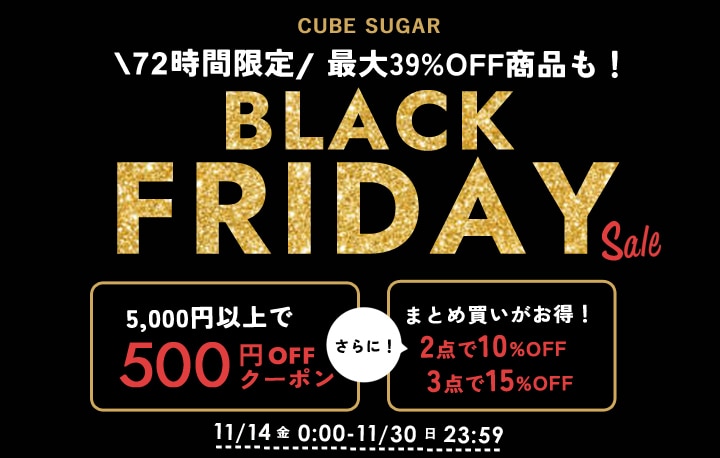 今年もBIGセールがやってきました! 年に一度のブラックフライデーセールスタート! 今回は、お得な「重ねて使える割引」をご用意いたしました。 欲しかったあのアイテムをお得に手に入れる大チャンスです! 5,000円以上のお買い物で500円OFFクーポン配布! さらに!3点以上のご購入で15%OFF!2点以上で10%OFF!でおまとめ買いがおとく♪ 72時間限定で人気商品が最大39%OFF! なんと、これらの割引はアウターも全品対象です! 最大39%OFFのアイテムを、さらにクーポンとまとめ買い割引でゲットできる大チャンス! ぜひご覧くださいませ♪