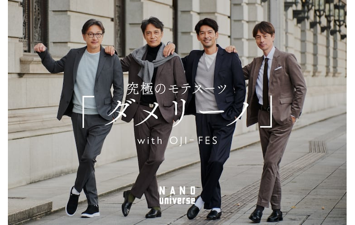 暑い夏を超えて、スーツスタイルが楽しくなる季節がやってきた。 ビジネスファッションを主戦場とするベテランのメンズモデルによる4人組ユニット、「おじフェス」を召集! 今欲しいのは、しっかりと着まわせて汎用性が高い、価格だけじゃなく本当の意味でコスパのいいスーツ。 スタイリッシュであることは当たり前の世の中で、ナノ・ユニバースが提案するのは、シルエットが美しい最強のコスパスーツだ。