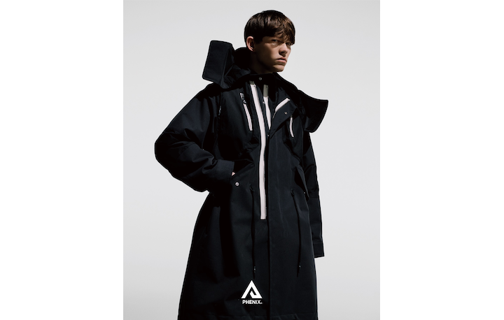 「COAT, TYPE P-001」 PHENIX独自開発の撥水、防風素材を主素材として使用した使用したフィッシュテールパーカー フレアなシルエットで後ろ袖にはアクションプリーツが施されている 不要なディテールをそぎ落としたデザインでソリッドムードを演出 キルティングライナーとフードは脱着が可能 異素材のコンビネーションとカッティング技術が融合したアイテム