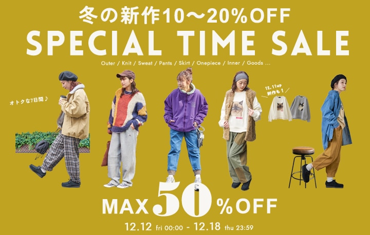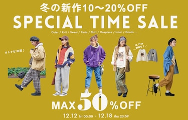 冬物アイテム大集結!7日間限定のタイムセール開催中! アウター、ニット、スカートなど冬の売れ筋アイテムが最大50%OFF! さらに新作も10~20%OFF! 12/18(木)までの限定チャンスをお見逃しなく!