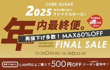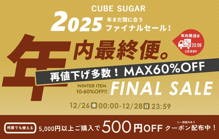 いよいよ2025年も残りわずか! 日頃の感謝を込めて、年内最終便。ファイナルセールを開催中! 今すぐ使える冬物アイテムが最大60%OFFと、さらにお求めやすくなりました。 さらに!期間中、5,000円以上のお買い上げで何度でも使える500円OFFクーポンを配布中です! 【年内発送のご案内】 12/28(日) 23:59までのご注文で年内発送いたします。 冬本番に活躍するアウターやニットなど、お得にゲットして新年を楽しく迎えましょう!