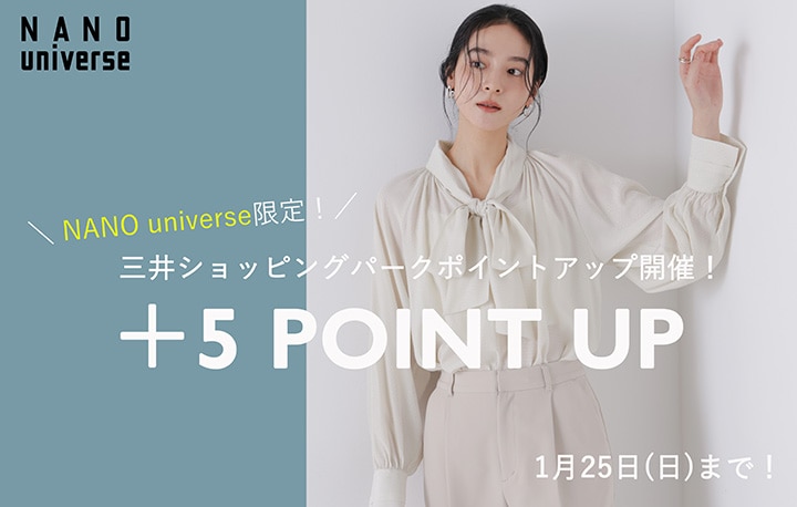 1/16(金)~1/25(日)の期間、NANO universe限定で三井ショッピングパークポイントのポイントアップを開催! 対象カード(※1)でのクレジット払いで、通常100円(税抜)につき2ポイントのところ、期間中は7ポイント! 対象以外でのお支払い(※2)で、通常100円(税抜)につき1ポイントのところ6ポイント! お得なこの機会に、ぜひショッピングをお楽しみください。 ※1 ・三井ショッピングパークカード《セゾン》 ・ラゾーナ川崎プラザカード《セゾン》 ・三井ショッピングパークカード《セゾン》LOOP ・三井ショッピングパークカード《セゾン》LOOPゴールド ・東京ミッドタウンカード《セゾン》(券面:シャンパンゴールド) ※2 ・※1の対象カード以外のクレジットカードでのお支払いや代金引換などでのお支払い ※本キャンペーンは&mallのNANO universe限定となります。 ・三井アウトレットパーク オンラインのNANO universeならびにららぽーとや三井アウトレットパークなどの商業施設店舗でのお買い上げは対象外です。