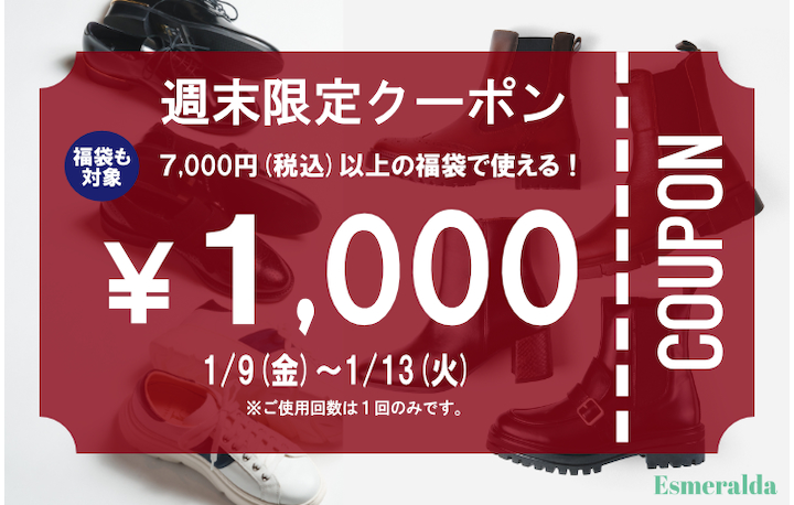 1/9(金)~1/13(火)限定!福袋も対象の¥1,000OFFクーポン配布中!!