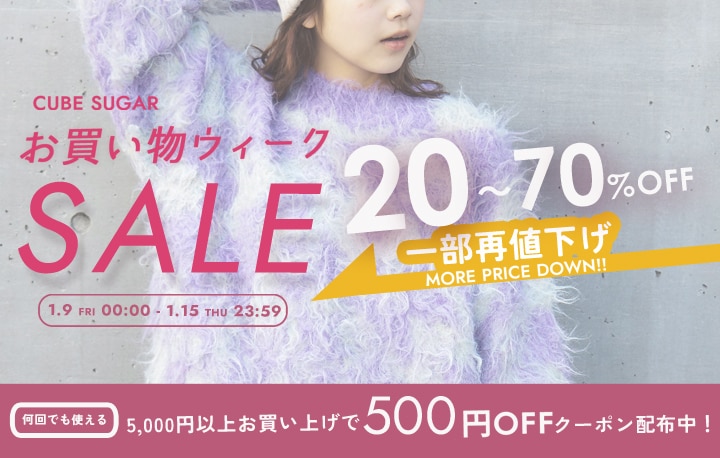 お買い物ウィークSALEがスタート! 今すぐ使える冬物アイテムから、春先まで活躍する定番品まで、なんと20%〜最大70%OFFの大特価! さらに!期間限定で5,000円以上のお買い上げで500円OFFになる、何度でも使えるお得なクーポンも配布中! 狙っていたあのアイテムをお得にゲットする大チャンスです。 ぜひこの機会に、CUBE SUGARでのお買い物をお楽しみください。