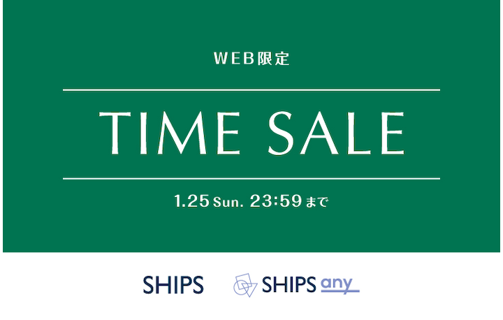 日頃よりSHIPSグループをご利用いただき、誠にありがとうございます。 1月25日(日)23:59まで、WEB限定のタイムセールを開催いたします。 期間限定で対象商品がお求めやすくなります。 この機会をお見逃しなく! ■開催日:2026年1月21日(水)0:00~1月25日(日)23:59 ※掲載商品は一部になります。