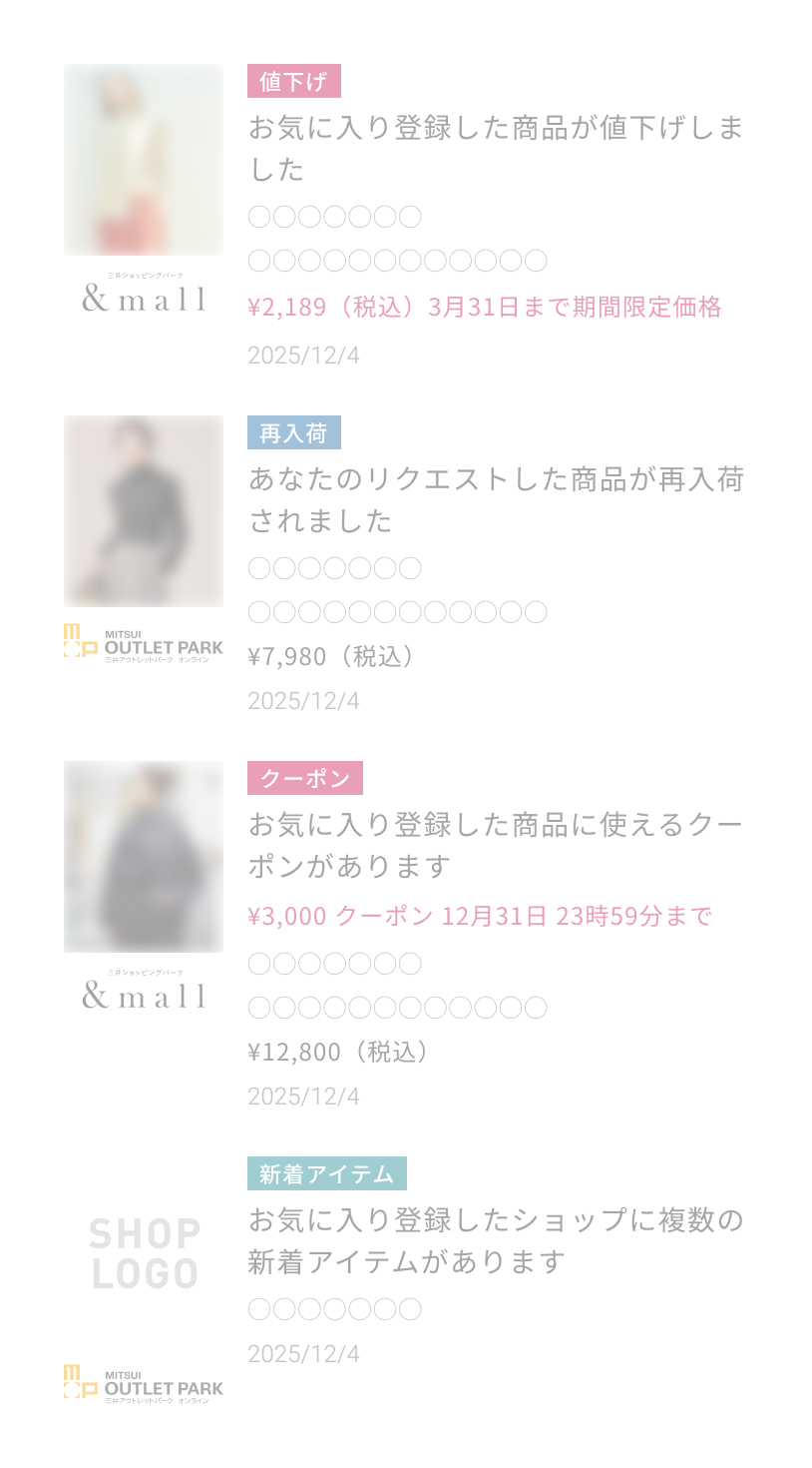 お客様が閲覧・お気に入り登録した商品やショップに関する情報(お得なクーポンや値下げ、商品の入荷情報等)をお届けします!