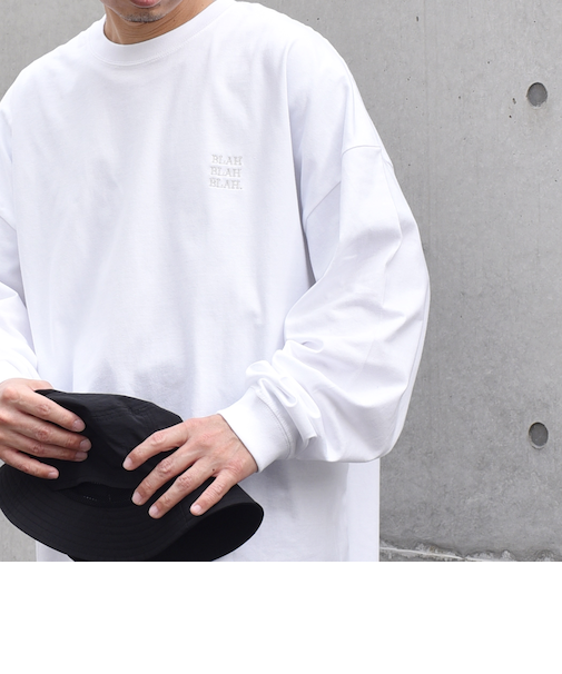 胸元にさりげなく刺繍されている「BLAH BLAH BLAH」とはヒップホップやレゲエの現場で曲の始まりや曲の最後によく使われるスラング。訳すと、「とかなんとか」のように自分にとっては、ばかばかしいと思う話・どうでもいい話だというニュアンスになり、映画のセリフなどでもよく耳にする言葉です。