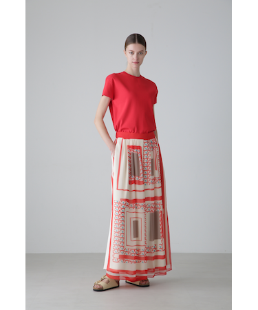 軽くしなやかなシフォン素材にスカーフの様なパネル状のモチーフを大胆にプリントした素材で仕立てました。
