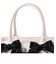 フロントに素材の異なるリボンをポイントにして、全体にガラスパーツをあしらったデイリーにお使いいただけるトートバッグです。マチもたっぷりとありますのでしっかり物を入れてお使いいただけます。マグネットで簡単にカバーができるかぶせが付いていてバッグの中が見えにくいです。背胴にはアウトポケットがあり携帯など使用頻度の高いものをさっと取り出せます。