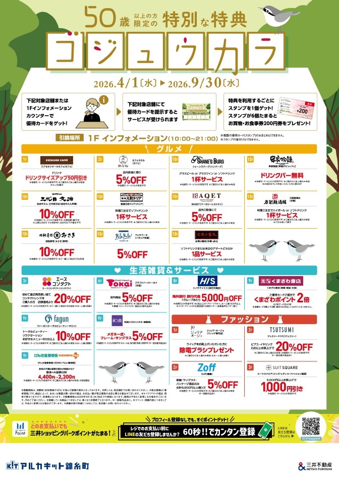 At Arcakit Kinshicho, by presenting the "Gojukara Coupon Card," which is available only to those 50 years of age or older,