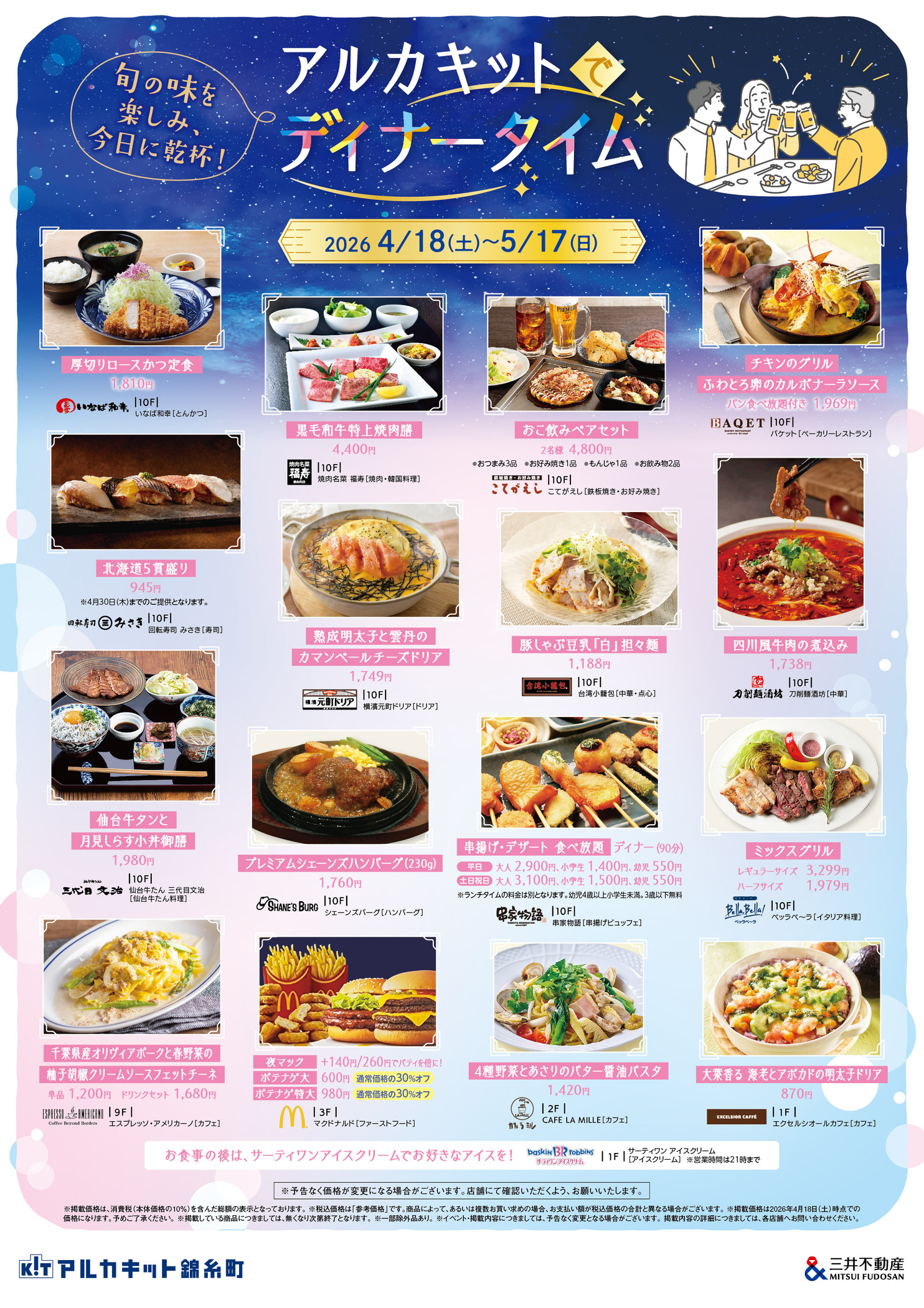 At Arcakit Kinshicho, we have prepared seasonal dishes, recommended menus from each restaurant, and celebratory menus as part of our "Enjoy seasonal flavors and raise a toast to today! Dinner time at Arcakit" event.