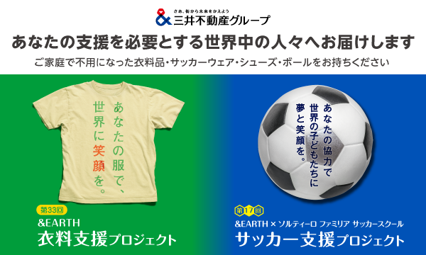 ご不用になった衣料品を世界各地の難民、避難民、被災地の人々へ寄贈する活動「&EARTH衣料支援プロジェクト」と、使わなくなったサッカー用具を寄贈する「サッカー支援プロジェクト」を開催いたします。また、会場では海外輸送費の一部をご負担いただくための募金もおこないます。ご家庭で眠っている衣料品やサッカー用具などをぜひお持ちください!