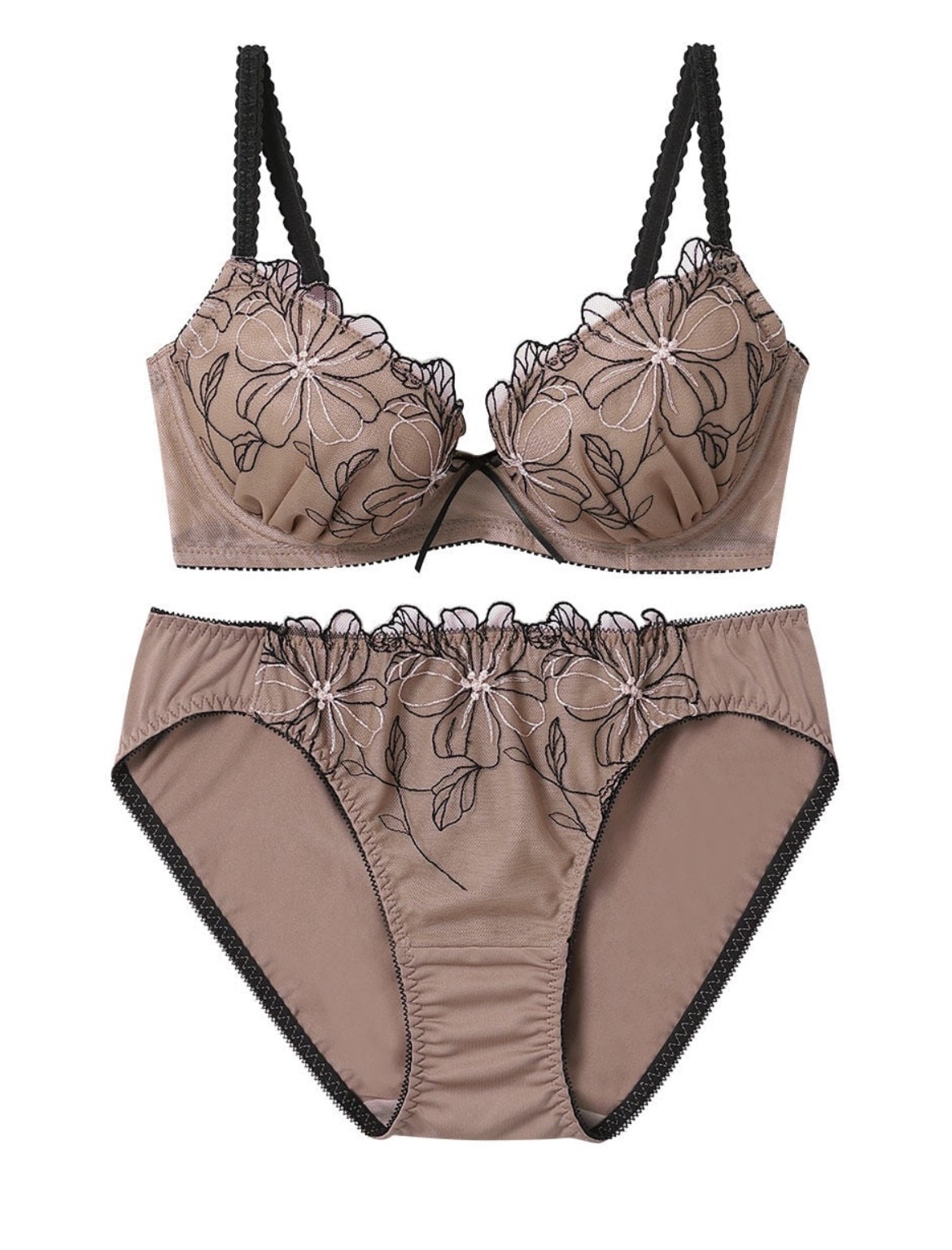A bra and panty set that creates a fuller bust and gives off a gorgeous impression with embroidered lace featuring a large flower motif made with glitter thread.