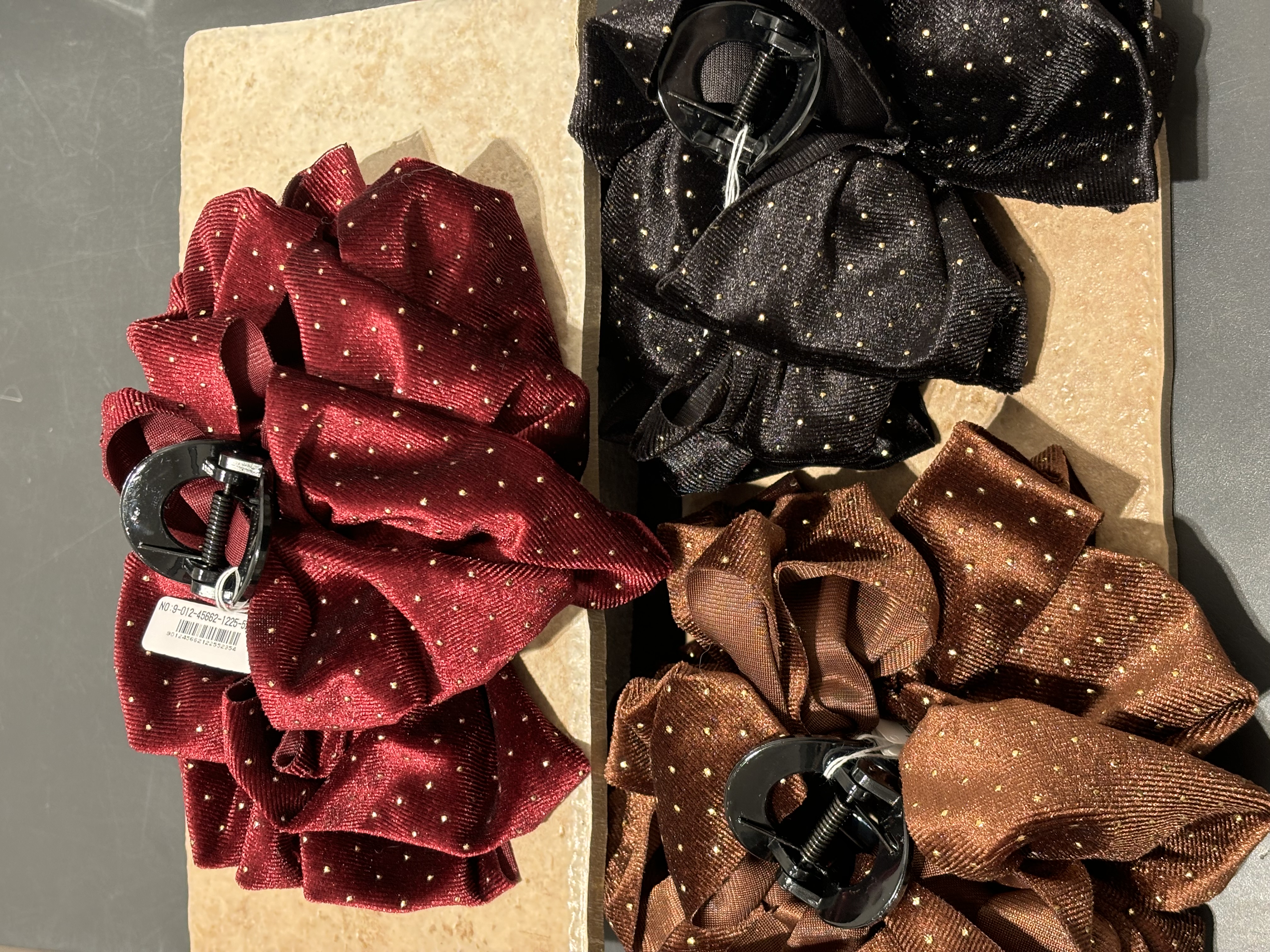 A sophisticated and feminine scrunchie clip made from high-quality, shiny dotted fabric.