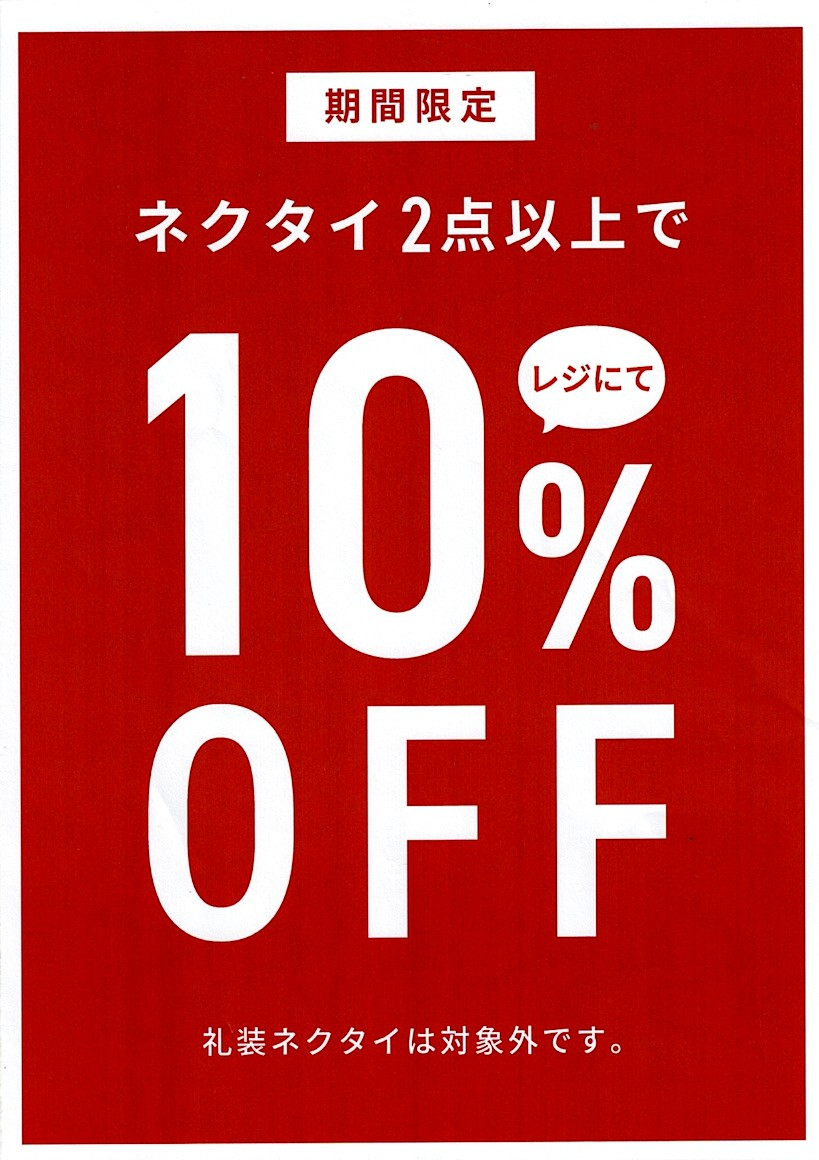 ・『店内セール品』とネクタイ対象、2点以上のお買上げで『レジにて10%OFF』!!