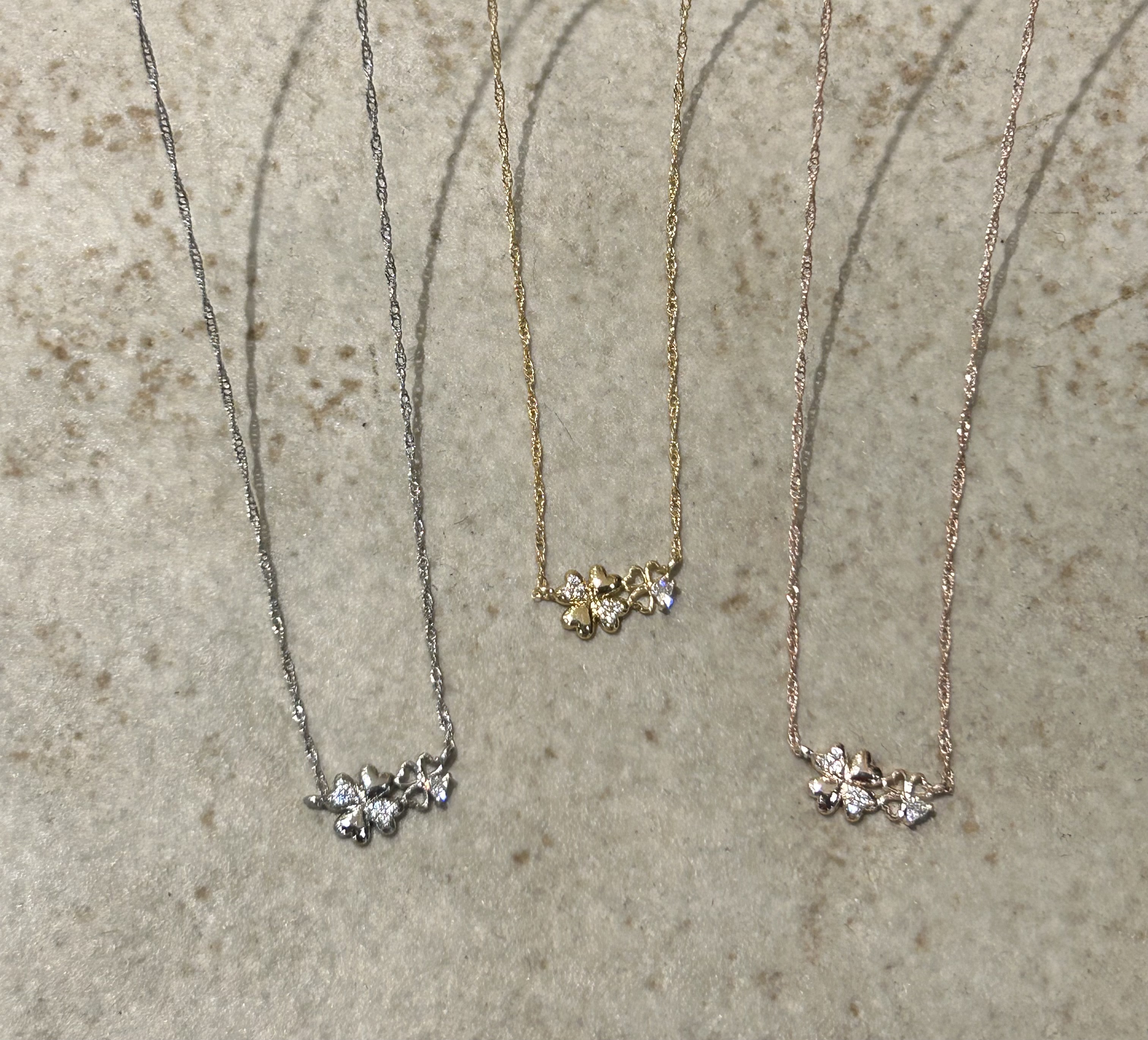 We have a new necklace in stock, featuring a delicate chain and a small four-leaf clover motif!