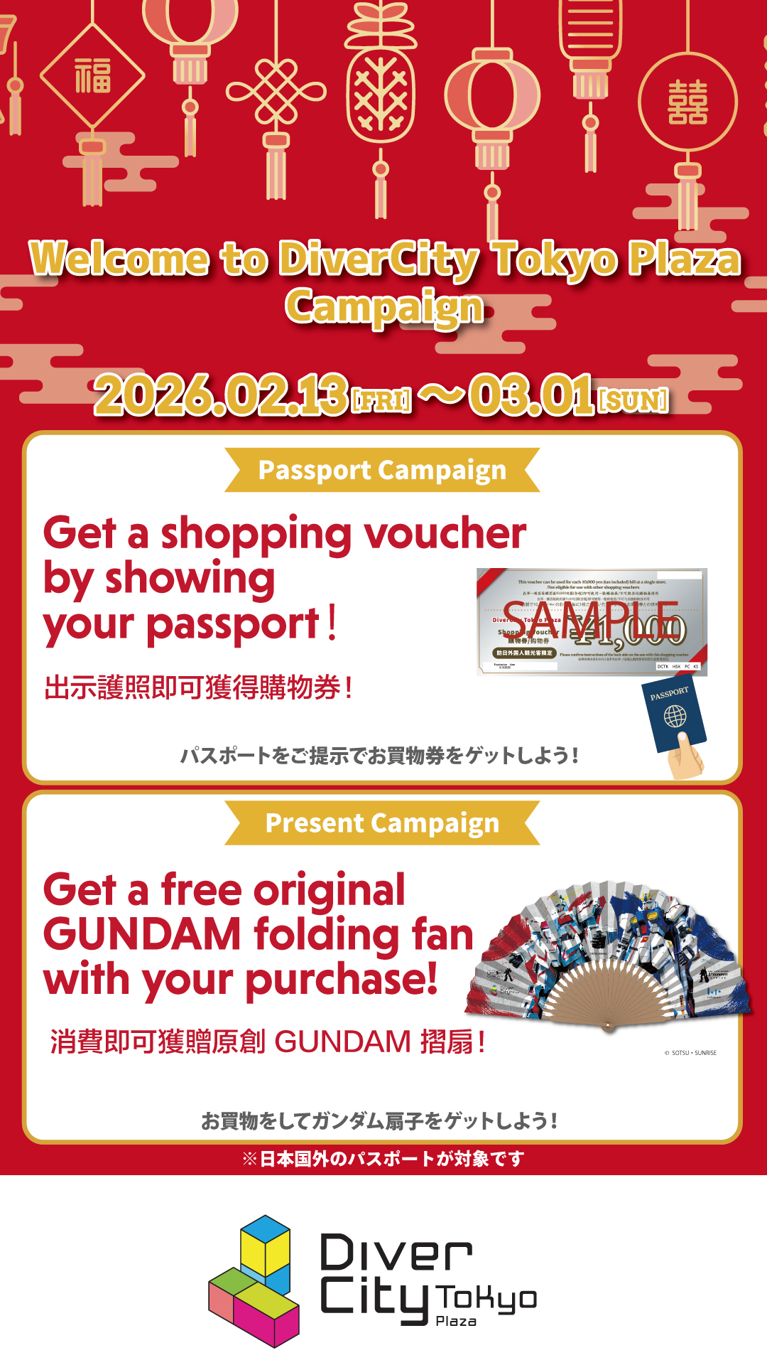 Please show your passport and a receipt of 15,000 yen or more (tax included, no combined receipts) at the Tourist Information & Tax-Free Counter on the 2nd floor to receive an original GUNDAM folding fan!