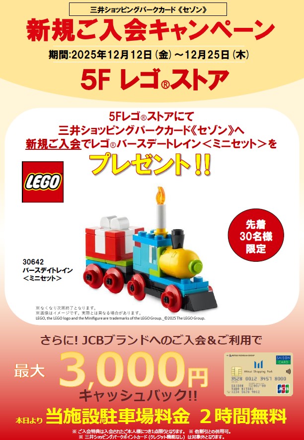 ■ Details During the campaign period, new members of the Mitsui Shopping Park Card "Saison" at the LEGO Store on the 5th floor will receive a "LEGO Birthday Train Mini Set" as a gift! In addition, if you sign up for and use a JCB brand card, you will receive a cash back of up to 3,000 yen.