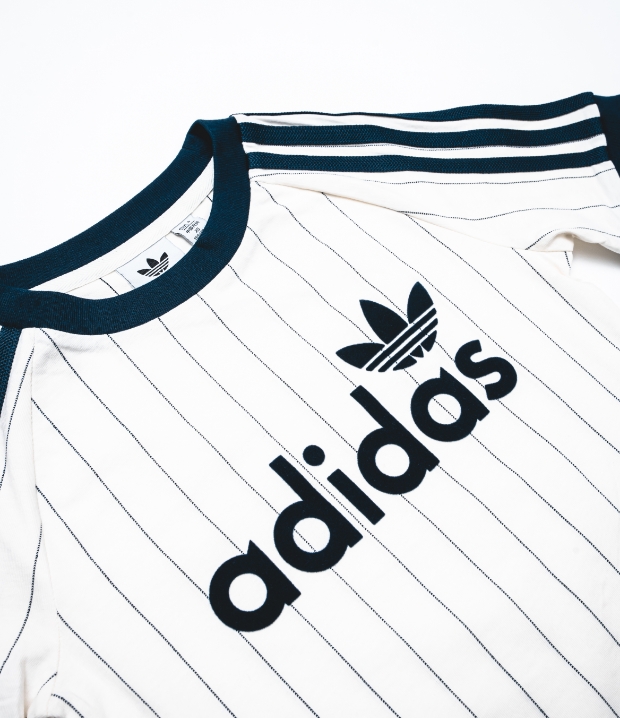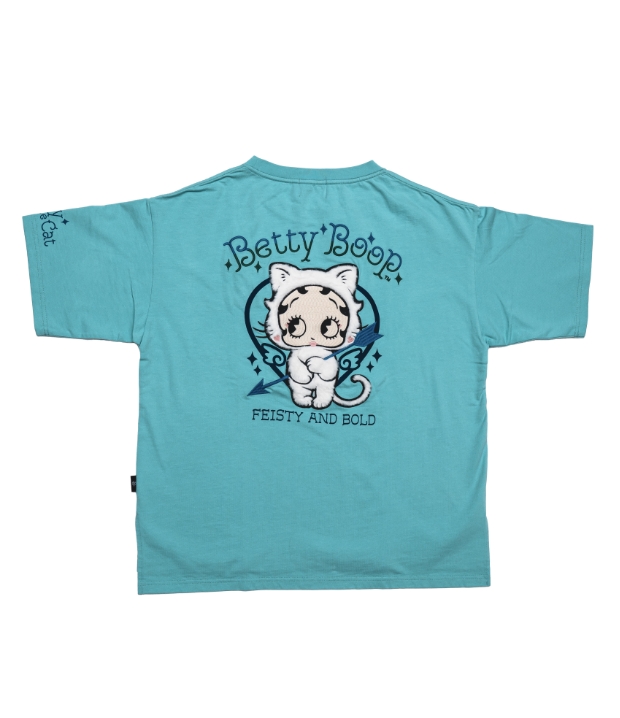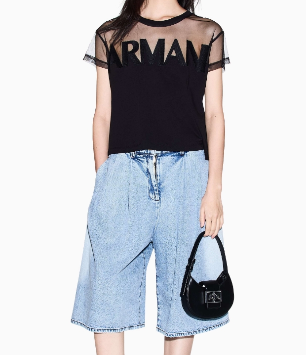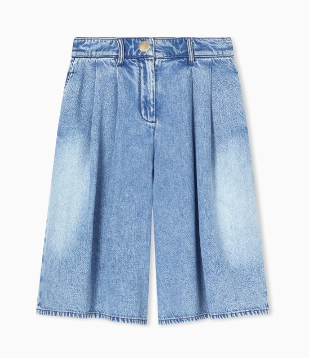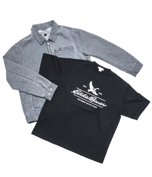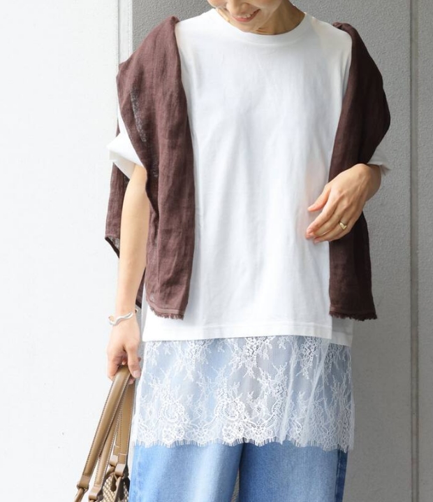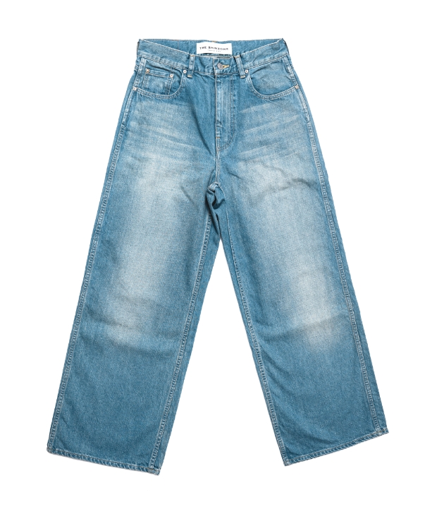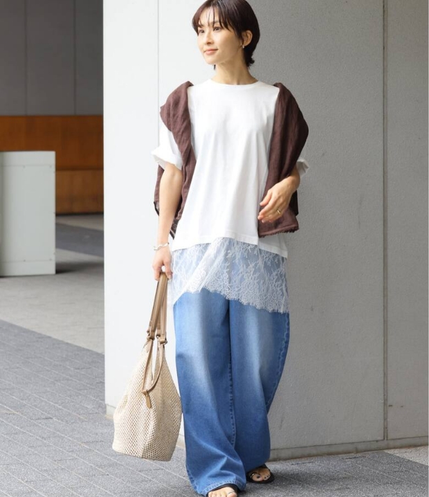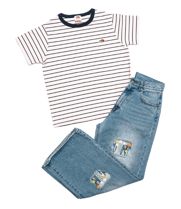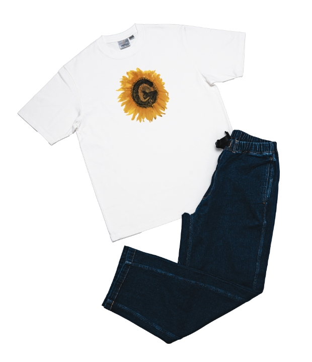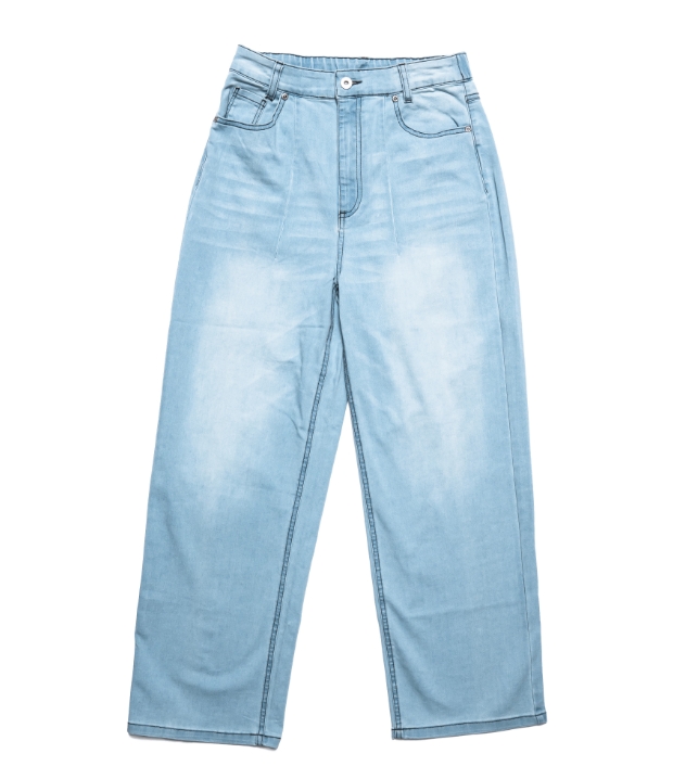 The cropped T-shirt looks great layered. The wide-leg denim pants with pleats are appealing for their refreshing light blue color and on-trend feel. This versatile piece can be enjoyed by both men and women.