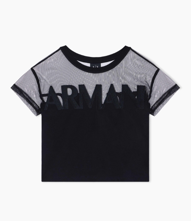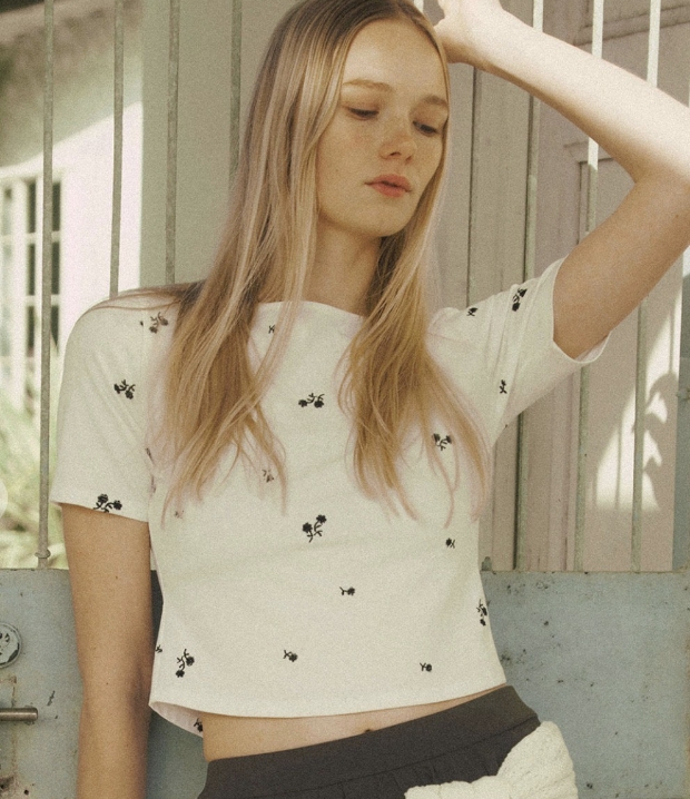 The cropped T-shirt features a beautiful neckline and a fitted cut, creating a sophisticated silhouette.