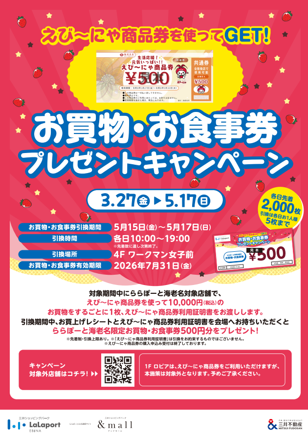 During the redemption period, bring your purchase receipt and Ebina gift certificate to the venue to receive a 500 yen shopping and dining voucher valid only LaLaport EBINA!