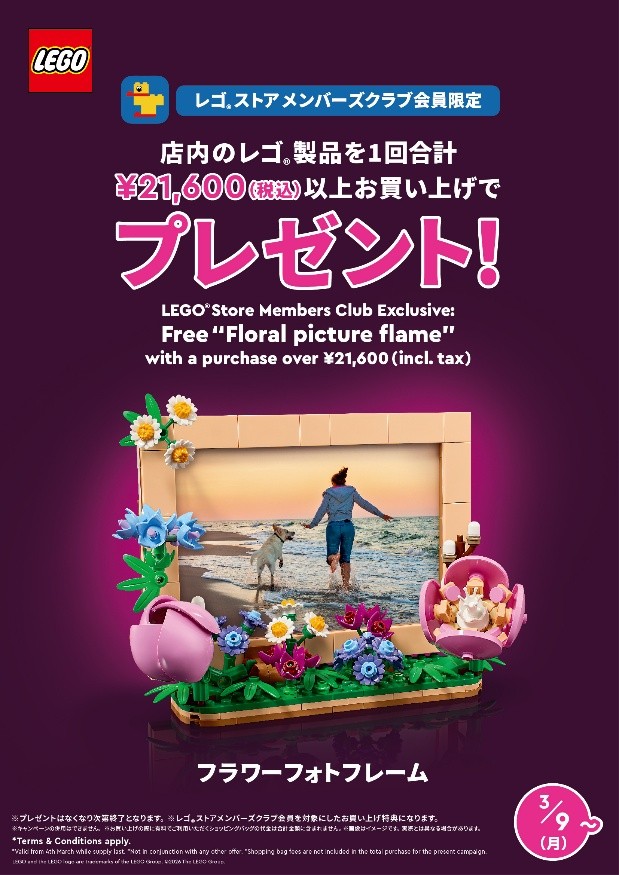 Starting Monday, March 9th, LEGO Store Members Club members will receive a free mini set of "Flower Photo Frames" with LEGOstore single purchase of 21,600 yen (tax included) or more in-store.