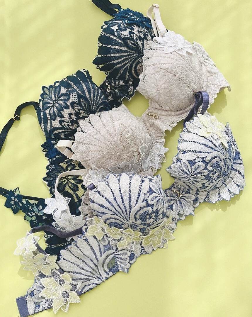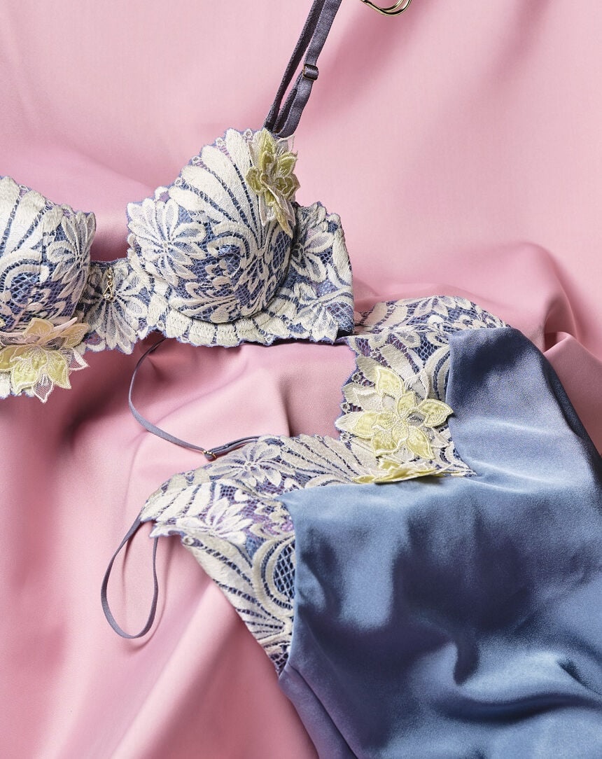 ●Different appliques on the left and right cups create a dynamic look.