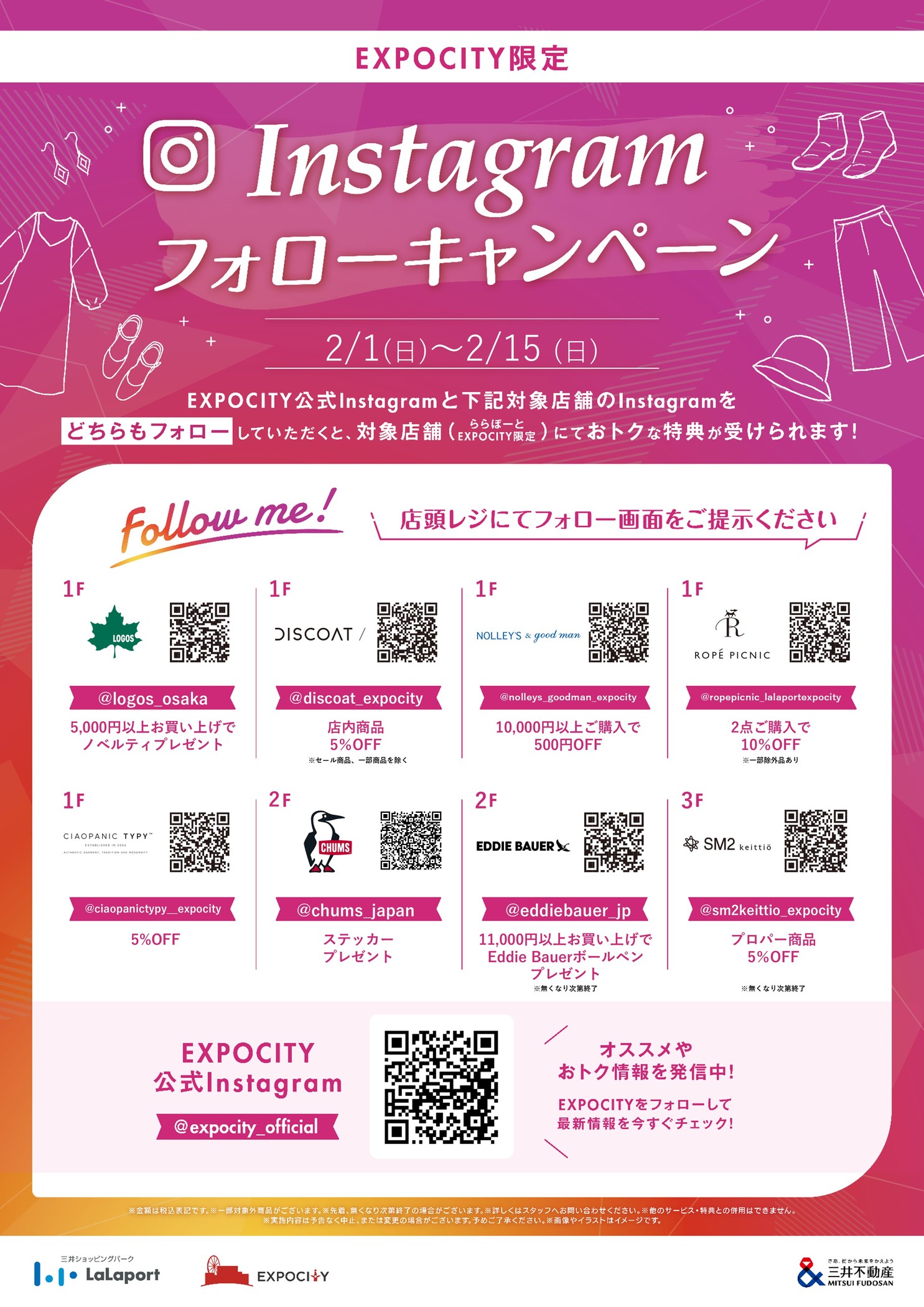EXPOCITYの公式Instagramと、対象店舗のInstagramをどちらもフォローしていただくと、対象店舗(ららぽーとEXPOCITY限定)にておトクな特典を受けられるキャンペーンを開催!