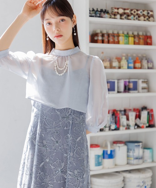 スパンコールを織り交ぜた花柄の刺繍素材を贅沢に使ったキャミワンピースと上品にまとめたブラウスをかけあわせたformformaオリジナルのワンピースドレス。