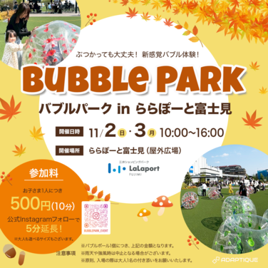 新感覚バブル体験!Bubble Park(バブルパーク)in ららぽーと富士見 開催のお知らせ