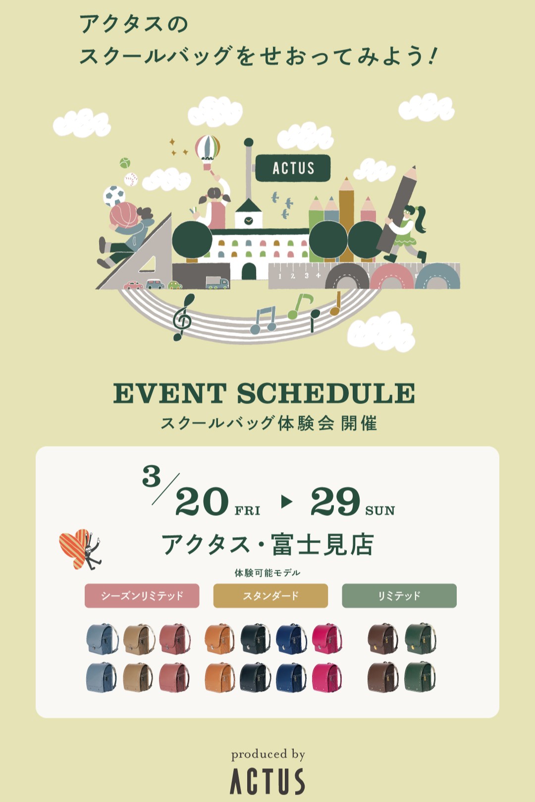 3/20(金・祝)~3/29(日)の期間アクタス富士見店では「2027年度ご入学用 スクールバッグ体験会」を開催いたします。