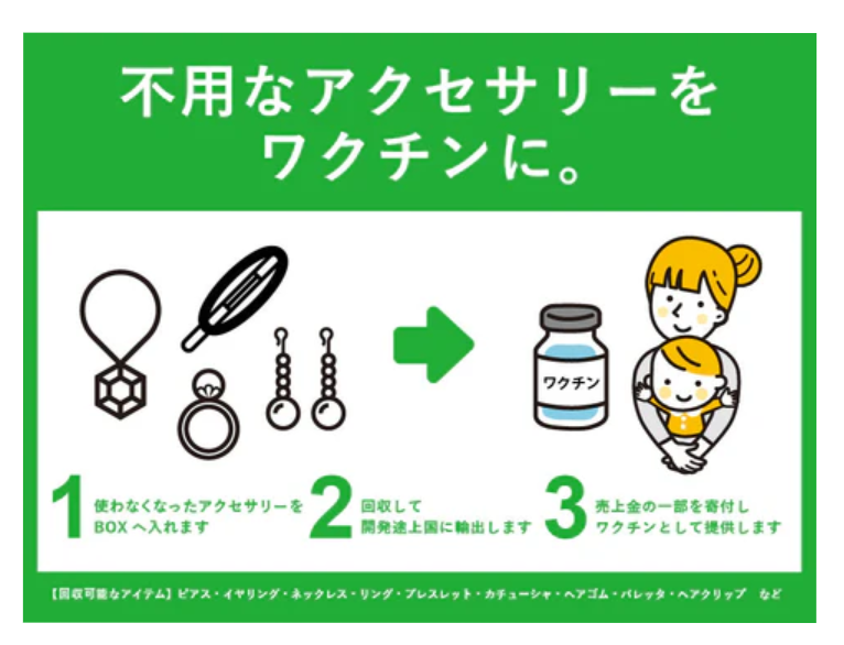 The accessories collected in stores are donated to the certified NPO Japan Committee Vaccines for the World's Children (JCV) through the Reborn Project, which delivers vaccines to children in Myanmar, Laos, Bhutan, and Vanuatu.