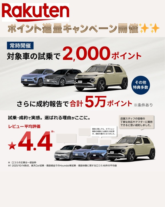 \常時開催!楽天carよりHyundaiの対象車種をご試乗&レビュー投稿・ご成約で楽天ポイント進呈キャンペーン!!/