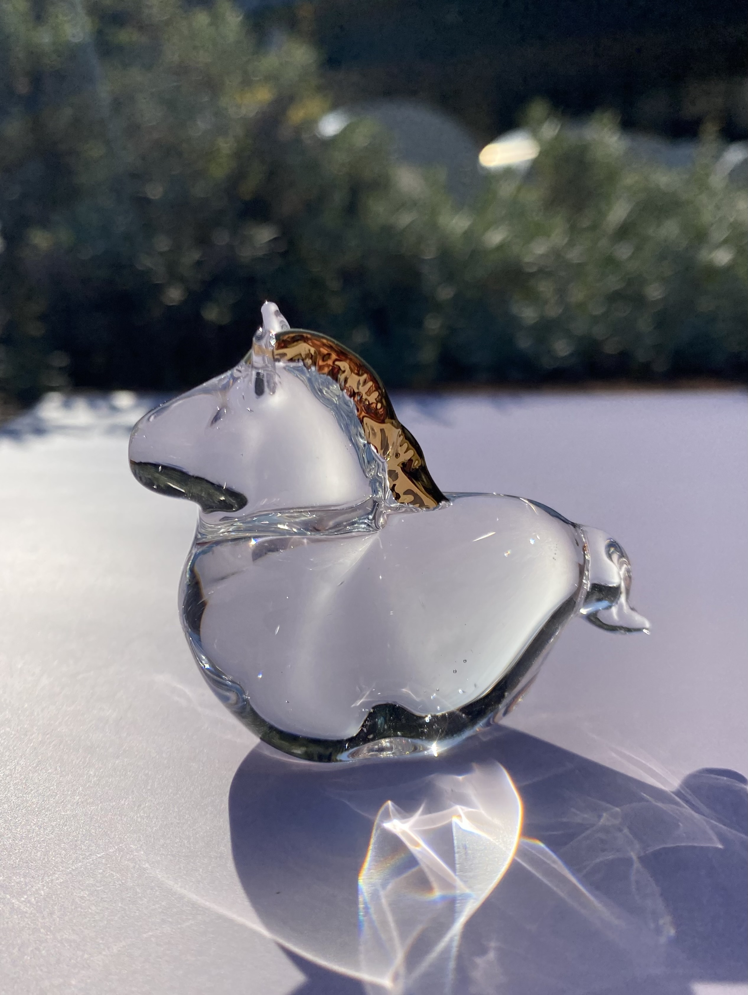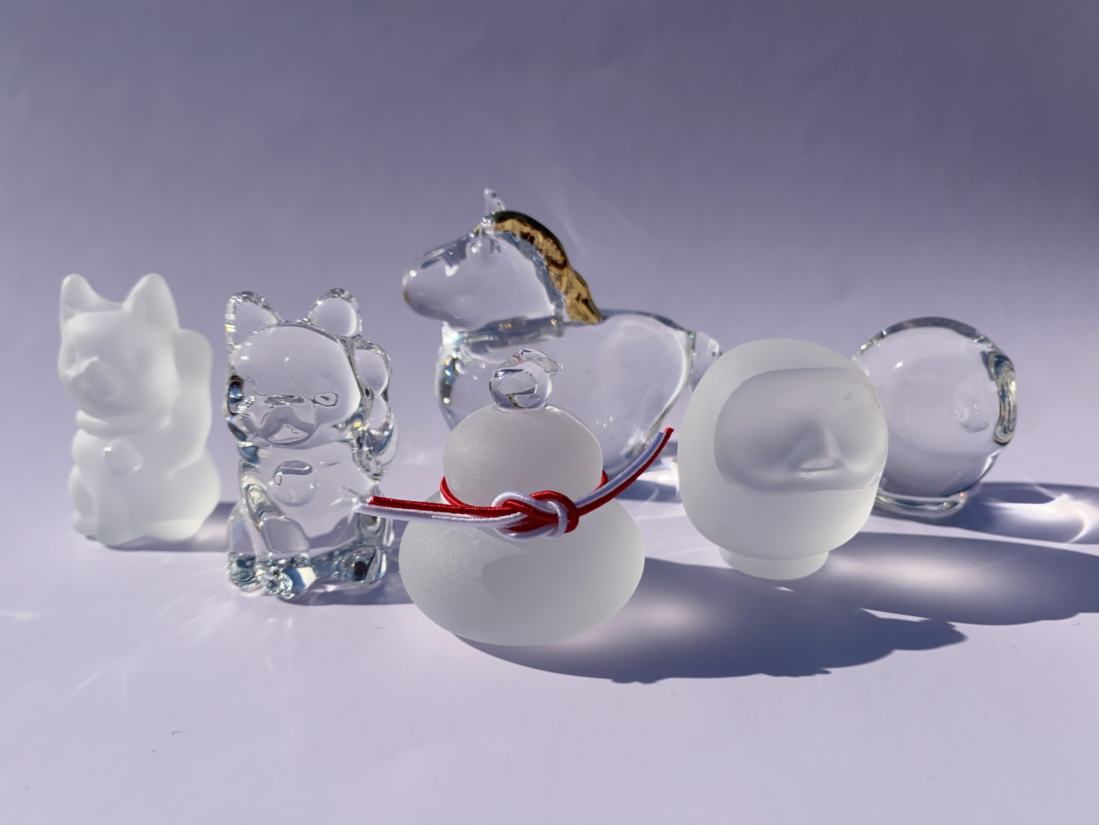 The "2026 Zodiac Horse" is made of transparent glass and features an elegantly shining gold mane, while the "Kagamimochi" is a soft rice cake made of frosted glass topped with a clear orange glass.